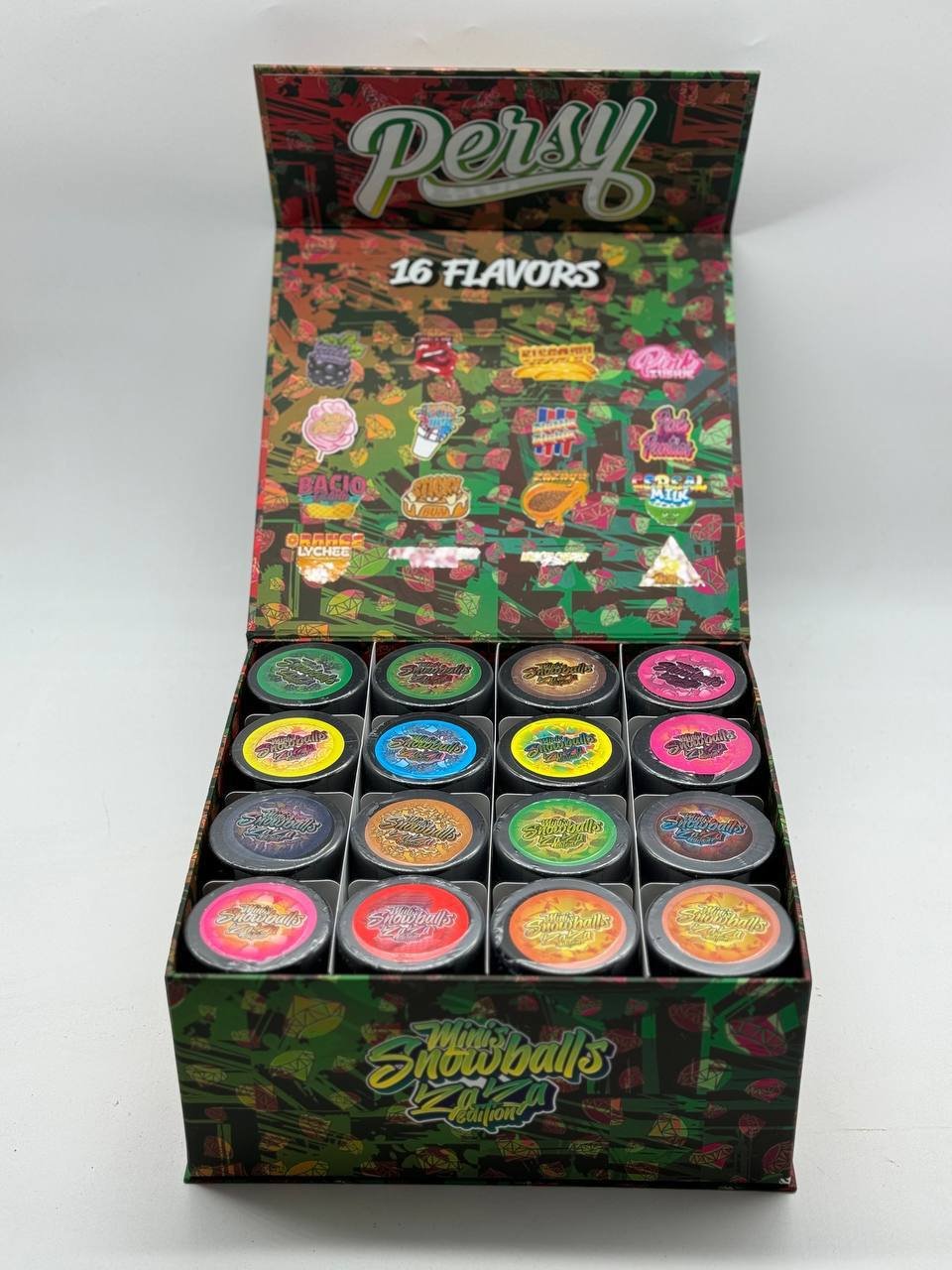 Looking for the ultimate premium THCa experience? The Persy Mini Snowballs Zaza Edition delivers exactly that — a 1-pound box packed with 16 individual 1oz glass jars of handcrafted, high-potency snowballs. Each jar contains premium indoor smalls coated in premium THCa diamonds and live resin for insane flavor, heavy potency, and a smooth, long-lasting high that cannabis connoisseurs crave.
